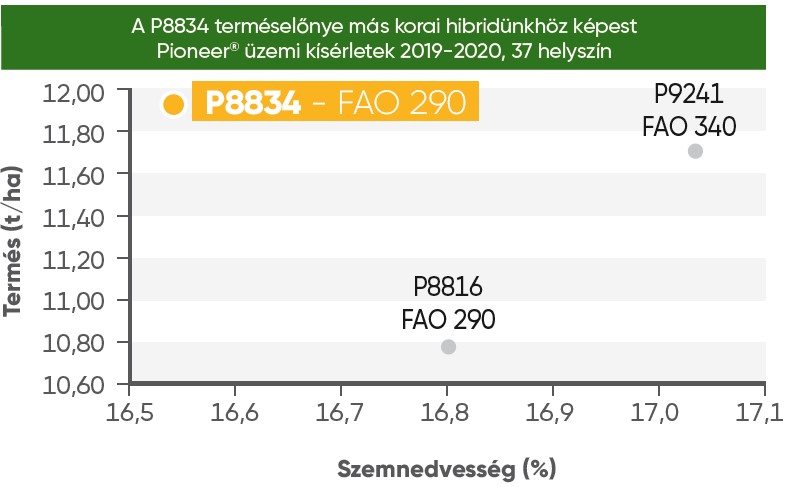 A P8834 egy korai tenyészidejű Optimum® AQUAmax® minősítésű hibrid. FAO száma 290, ennek tényére egy átlagos hazai gazdálkodó fel sem kapja a fejét, hiszen nem ez a legnagyobb érdeklődést kiváltó érésidő a magyar piacon. Viszont ez a hibrid rácáfol a kétkedőkre megjelenésével és terméseredményeivel!