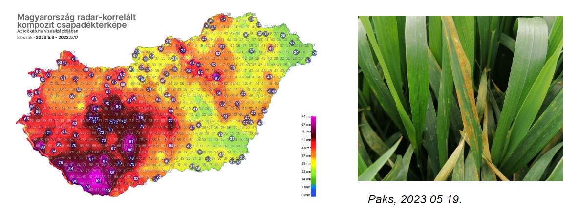 Amennyiben a jövő héten beigazolódik az előrejelzés és 20 °C-ot lényegesen meghaladó napi maximumhőmérsékletek kezdődnek, akkor számítani lehet a vörösrozsda megjelenésére is. Mivel most kezdődik az őszi búza kalászhányása, az ellene való védekezés már valószínűleg összeköthető lesz a célzott kalászvédelemmel.