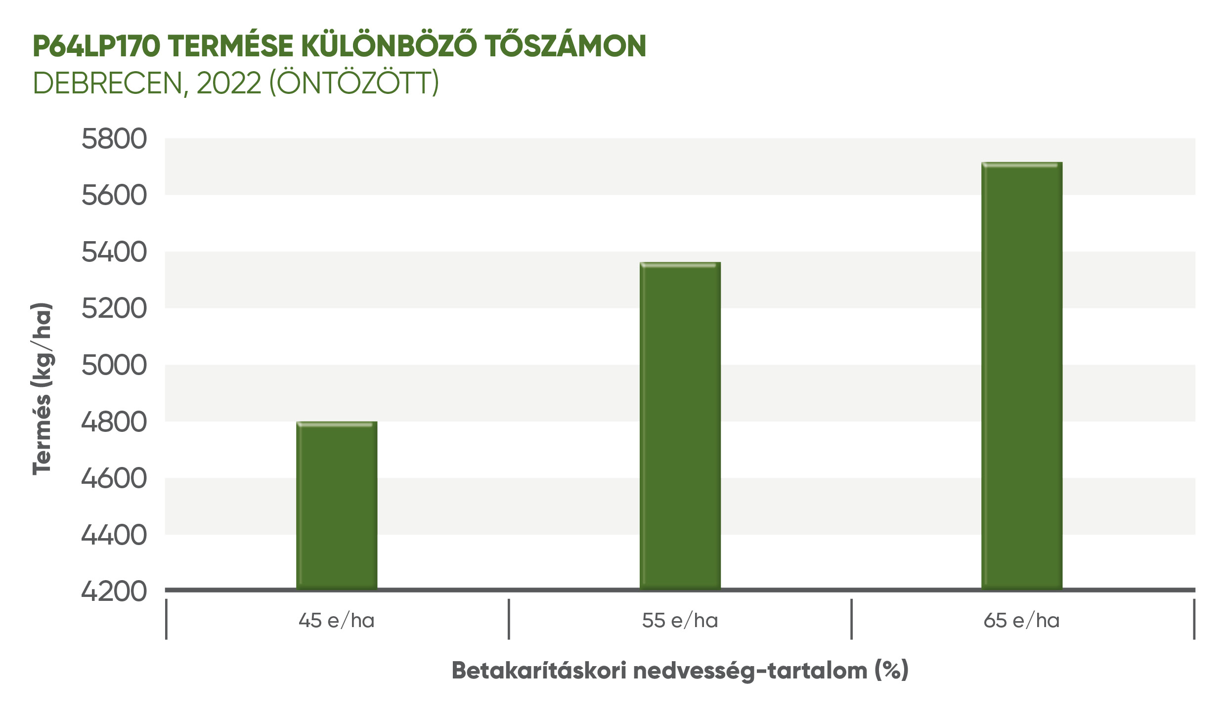 Több kísérletben is megmutatkozott, hogy az alkalmazott tőszám emelésével folyamatos terméstöbblettel reagál mindkét hibrid. Ezt jól illusztrálja a látóképi kísérlet a P64LP170 esetében.