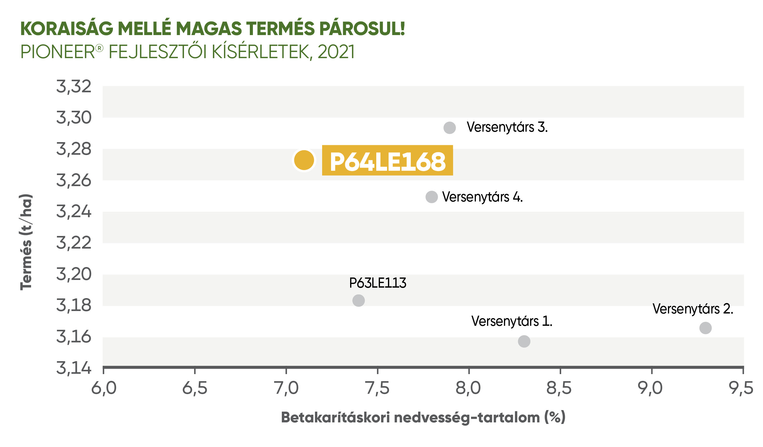 A P64LE168 a korai érésideje végett a korábbi P63LE113 mellé érkezik a kínálatunkba, fejlesztői kísérleteinkben az egyik legalacsonyabb betakarításkori nedvesség-tartalom jellemezte, ehhez meglepően magas termés párosult. Szintén koraisága miatt kiválóan alkalmas megkésett vetésekre is, normál vetésidő mellett pedig csekély az esély arra, hogy esetleg deszikkálni szükséges az állományt betakarítás előtt.