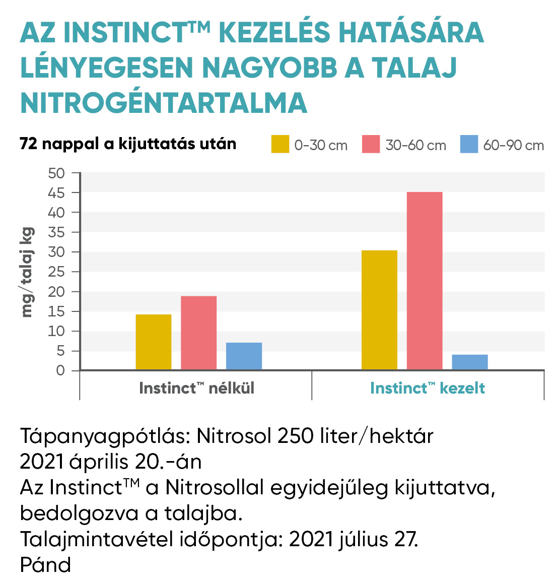 Az Instinct™ hatékonyan képes lassítani a talajbaktériumok nitrogén átalakító tevékenységét, aminek eredményeként a talajban stabilan kötődni képes ammónium-nitrogén hosszabb ideig marad a gyökérzónában. A talajvizsgálatok eredményei is alátámasztják az Instinct™ növények számára felvehető tápanyag visszatartó hatását, melyet az alábbi kísérlet is szemléltet.