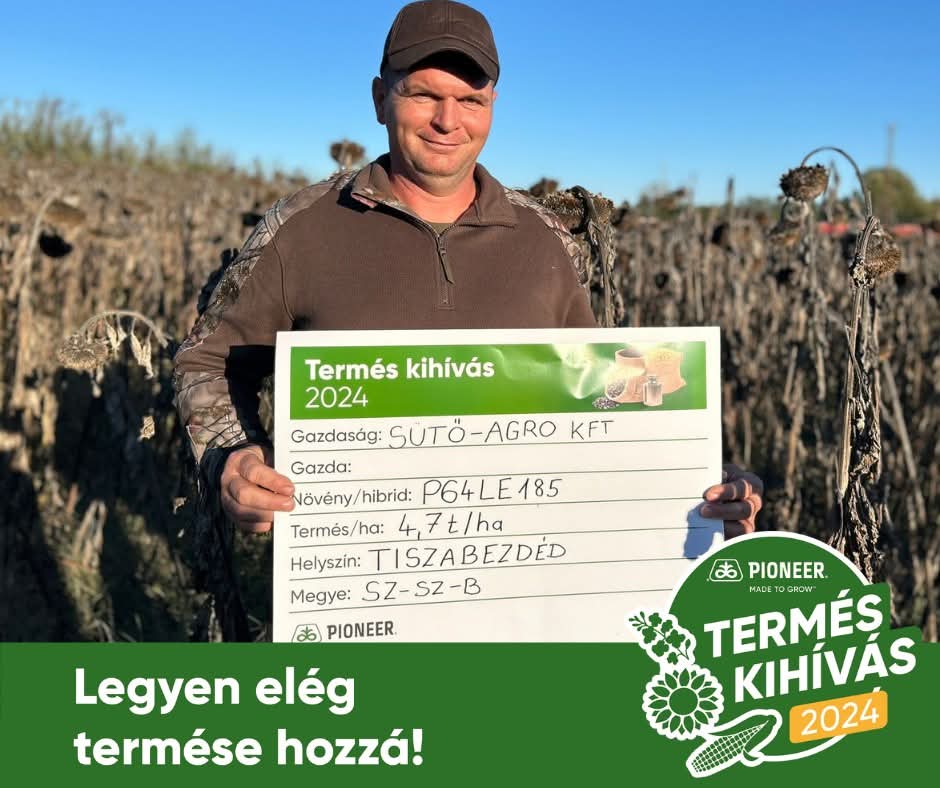 Sütő István, a Szabolcs-Szatmár-Bereg vármegyében található Sütő-Agro Kft. tulajdonosa napraforgóban elért 4,7 t/ha terméseredményéről így nyilatkozott: „A P64LE185 napraforgó hibridet 2024-ben próbáltuk ki először nagyüzemi körülmények között. Tapasztalatunk alapján ez a hibrid már a kezdeti fejlődése során kiemelkedett a fajtasorból, amit egész évben meg is tartott és az adaptációs képessége, valamint a betegségekkel szembeni ellenállósága is kiemelkedő, mindemellett stabil és magas hozamot is nyújt számunkra. Vetéskor és a sorközművelés alkalmával összesen 500 kg műtrágyát juttattunk ki hektáronként, az intenzív növekedés fázisában lombtrágyázás is történt, valamint a Corteva BlueN® mikrobiológiai termékével biztosítottuk a folyamatos nitrogén ellátottságot. A megfelelő időben történő gyomirtás, valamint gombaölőszer használata is része volt a komplex növényvédelmi technológiának, amelyek együttesen biztosították a napraforgó egészséges fejlődését és a magas hozam elérését. A Pioneer® hibridekkel szerzett tapasztalataink az évek során mindig pozitívak voltak. A hibridek kiemelkedő teljesítményt nyújtanak különböző körülmények között, továbbá magas terméshozamot és erős betegségellenállóságot is biztosítanak. A folyamatos fejlesztéseknek köszönhetően mindig megbízható eredményeket értünk el, ezért elégedettek vagyunk a hibridek minőségével és teljesítményével.”