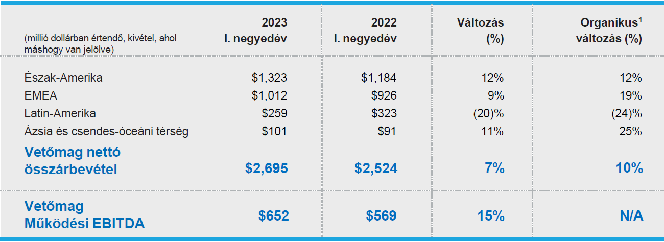 A vetőmag üzletág nettó árbevétele 2023 első negyedévében 2,7 milliárd dollár volt, szemben a 2022 első negyedévi 2,5 milliárd dollárral. Az árbevétel növekedését a 17%-os áremelkedés, valamint a portfólió és egyéb 2%-os kedvező hatása okozta, amit részben ellensúlyozott a 7%-os volumencsökkenés és az 5%-os kedvezőtlen árfolyamhatás.
