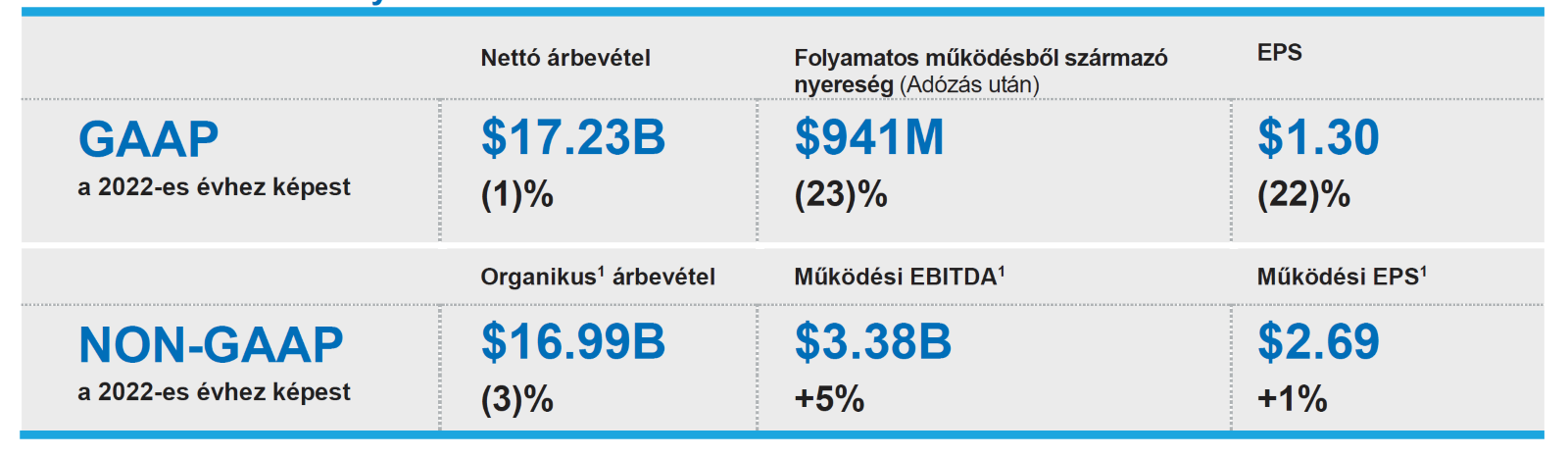 • A folytatódó tevékenységekből származó GAAP szerinti nyereség és egy részvényre jutó eredmény (EPS) 941 millió dollár és 1,30 dollár volt részvényenként, ami 23%-kal, illetve 22%-kal alacsonyabb az előző évinél.