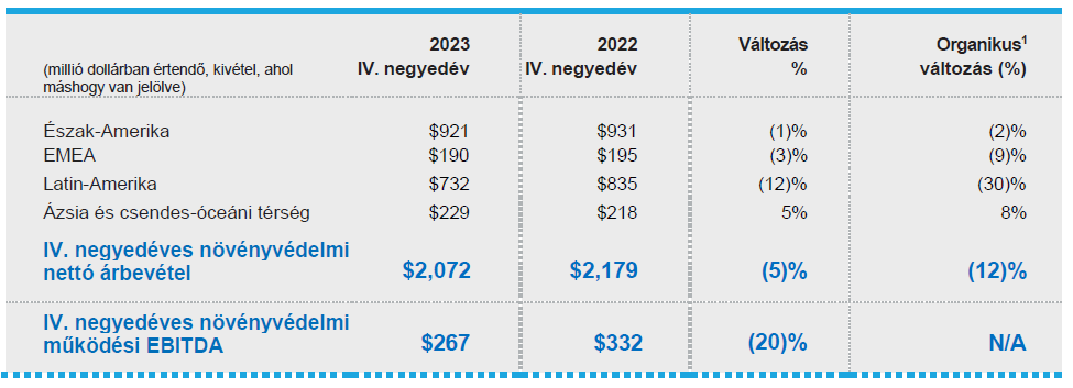 A növényvédelmi szegmens nettó árbevétele 2023 negyedik negyedévében megközelítőleg 2,1 milliárd dollár volt, szemben a 2022 negyedik negyedévi megközelítőleg 2,2 milliárd dollárral. Az árbevétel csökkenését a volumen 8%-os és az ár 4%-os csökkenése okozta, amit részben ellensúlyozott a portfólió 6%-os kedvező hatása.
