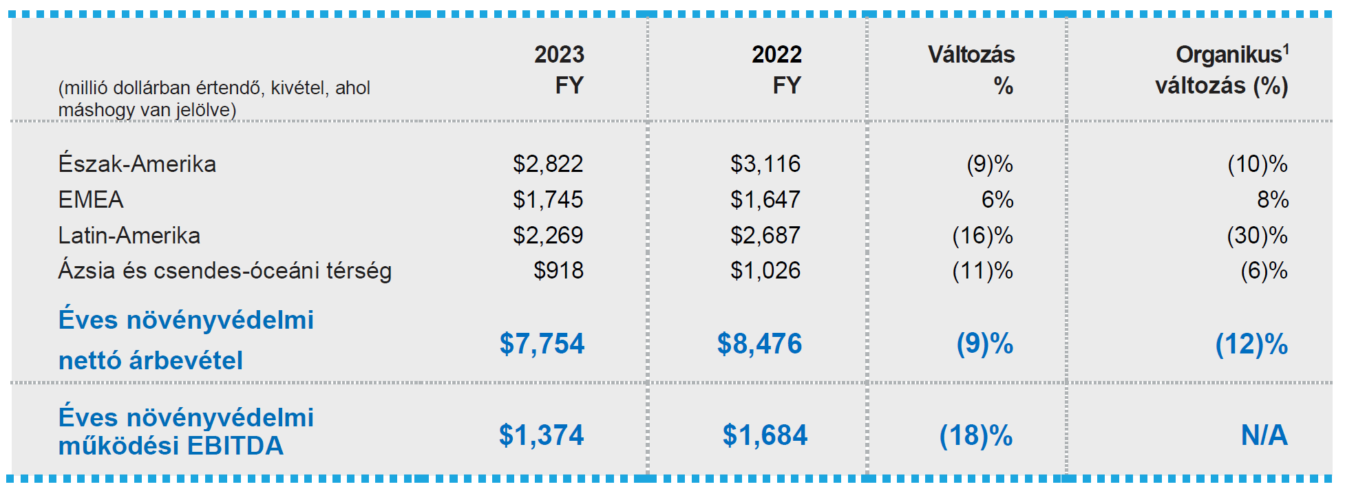 A volumen csökkenését a stratégiai termékkivonások, a készletek leépítése és a késedelmes termelői vásárlások okozták. Az árnövekedést az EMEA régió vezette, és főként az egyedi technológiánk értékének - beleértve az új termékeket is - és az EMEA régió árképzését tükrözte, amit részben ellensúlyozott a Latin-Amerikában és Észak-Amerikában tapasztalható kihívásokkal teli piaci dinamika. A kedvezőtlen árfolyamhatásokat a török líra és a kínai renminbi okozta. A portfólió hatása a Biológiai akvizícióknak köszönhető, amelyek mintegy 420 millió dollárral növelték a nettó árbevételt.
