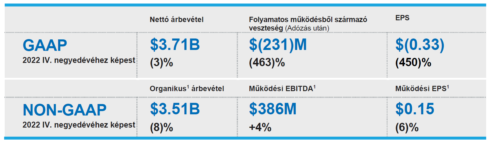 A folytatódó tevékenységekből származó GAAP szerinti nyereség az adózás után 231 millió dolláros veszteség volt 2023 negyedik negyedévében, szemben a 2022 negyedik negyedévi 41 millió dolláros veszteséggel. A működési EBITDA1 a negyedik negyedévben 386 millió dollár volt, ami 4%-kal magasabb az előző évinél.