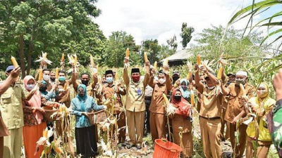 REDELONG - Bupati Bener Meriah Tgk H Sarkawi yang diwakili oleh Plh Sekda Abd Muis SE MT menghadiri kegiatan panen perdana program ketahanan pangan komoditas jagung pipil di Kampung Blang Paku, Kecamatan Wih Pesam, Selasa (29/9/2020).