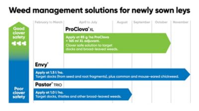 Pastor® Trio can be applied to new sown leys at 1.0 L/ha from 1st February to 31st August, and so is suitable for use on spring established new sown leys. Envy™ can be applied to new sown leys at 1.5 L/ha from 1st February to 30th November and so can be used on both autumn and spring established new sown leys.