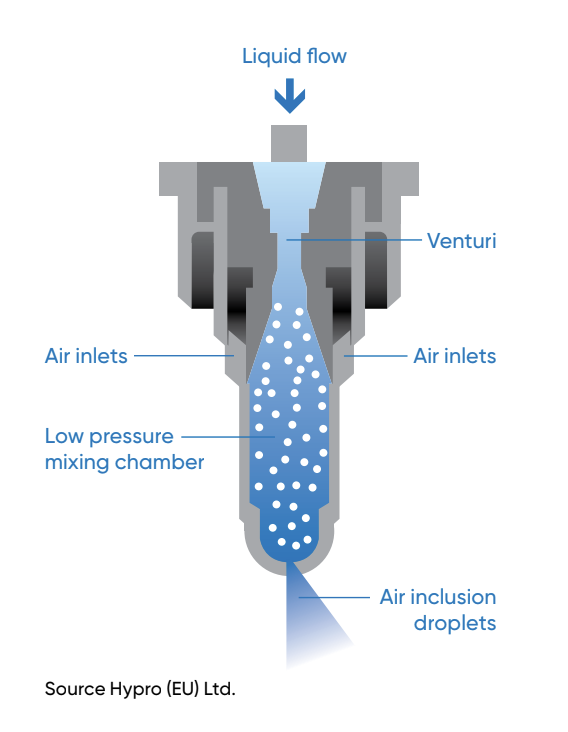 This coarser droplet enables thespray to travel accurately from nozzle to target. On impact the bubble bursts leaving smaller droplets across the leaf for absorption. This means less drift and more deposit of product on to the target leaf.