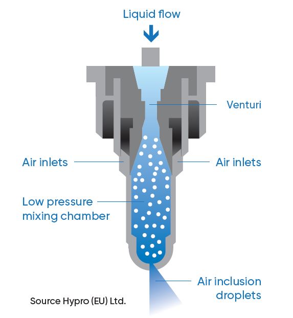 This coarser droplet enables the spray to travel accurately from nozzle to target. On impact the bubble bursts leaving smaller droplets across the leaf for absorption. This means less drift and more deposit of product on to the target leaf.