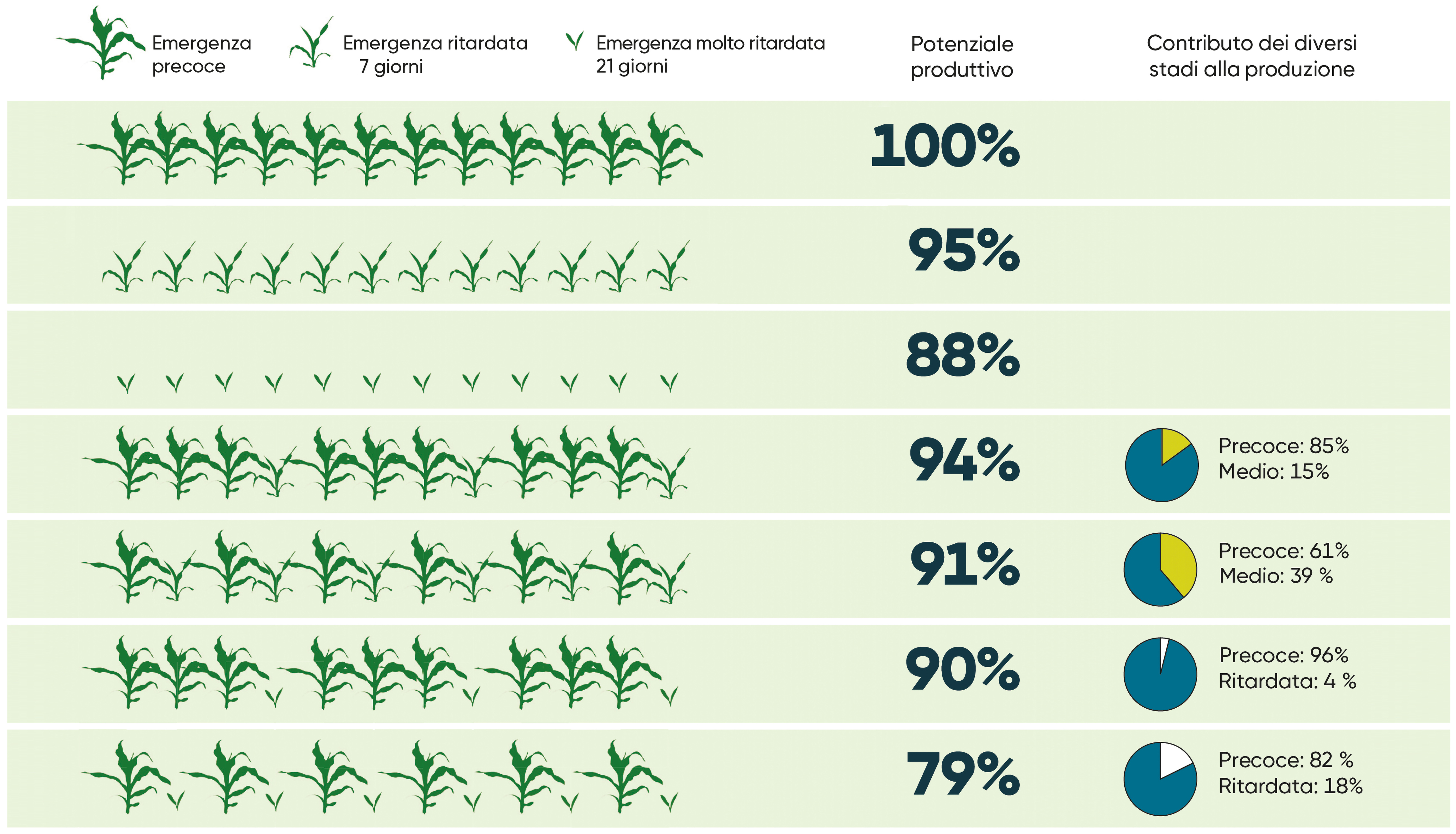 Un risultato ricorrente in diversi studi è che il momento dell’emergenza non è sempre un forte predittore della resa della singola pianta (Kovács e Vyn, 2014; Nemergut et al., 2021).
