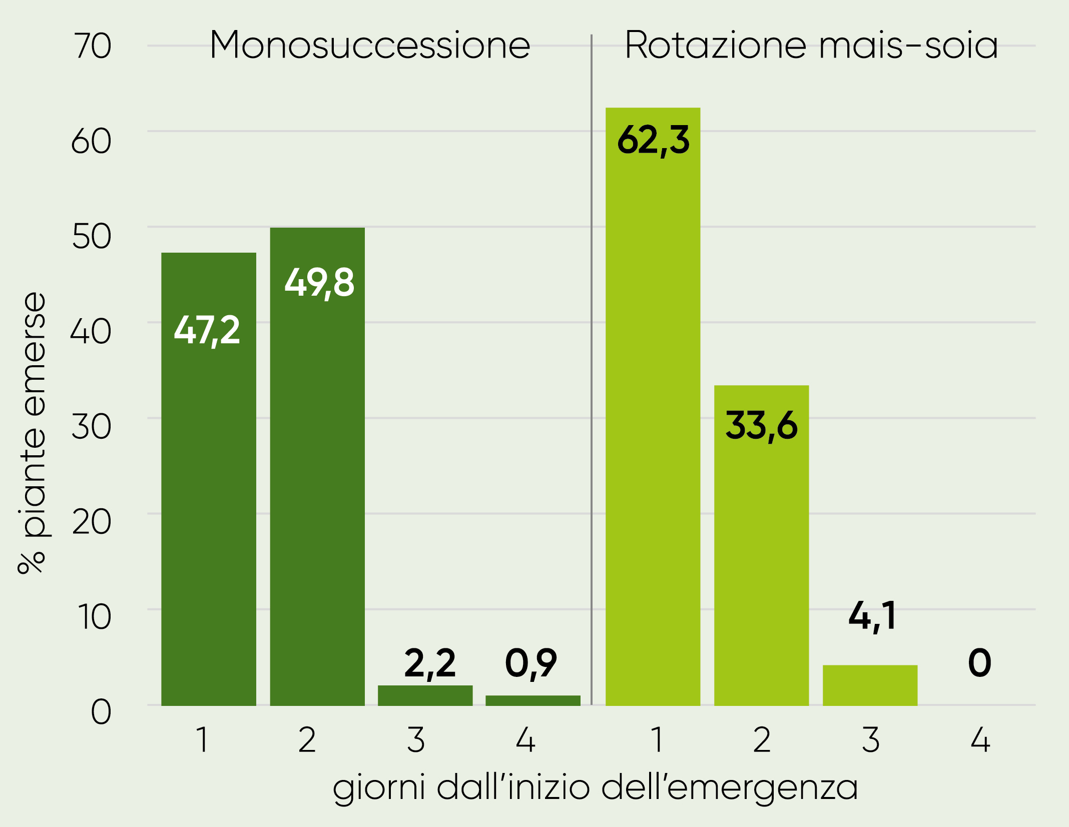 Uno studio di campo condotto da Pioneer in Iowa, ha confrontato il momento dell’emergenza del mais in monosuccessione e in rotazione mais-soia (Figura 5). Le piante emerse sono state contrassegnate e contate ogni giorno. In entrambi i sistemi, quasi tutte le piante sono emerse nei primi due giorni e l’emergenza ha raggiunto il 100% al giorno 3 nella rotazione mais-soia e al giorno 4 nel mais in successione a mais (Grafico 1).