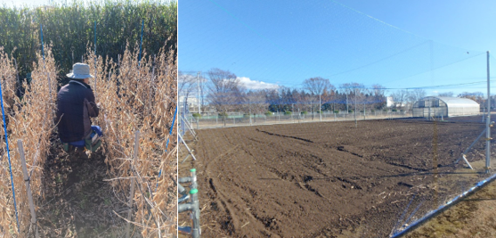 2024年11月下旬に、成熟した遺伝子組換えダイズと非組換えダイズの比較調査を行いました(写真左)。露地栽培の植物体については、同年12月よりすき込みを開始し、処分いたしました(写真右)。