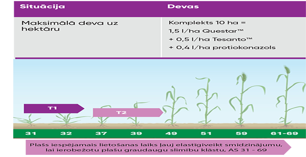 Questar™ un Tesanto™ koplietošana duo-pakā nodrošina pilnīgu, efektīvu risinājumu graudaugu slimību kontrolei kviešos, rudzos un tritikālē: