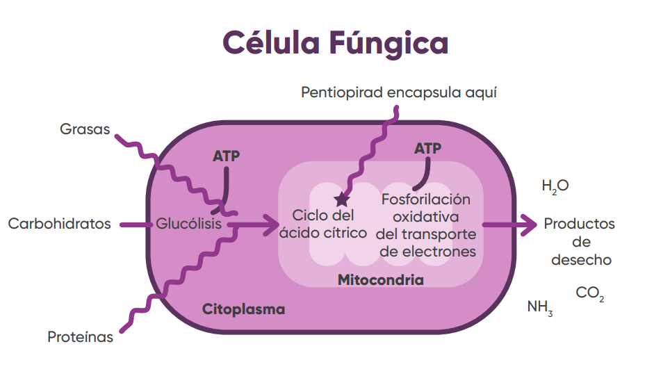 El ingrediente activo (i.a.) de Fontelis® (Pentiopirad) se une, y funcionan dos vías respiratorias importantes, el ciclo del ácido cítrico y el transporte de electrones mitocondriales, ambas vías son inhibidas.