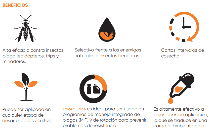 Tracer™ Edge es un miembro de la clase de los Spinosines desarrollado por Corteva Agriscience™ como una herramienta de manejo para el control de insectos, derivados de la fermentación de la bacteria Saccharopolyspora spinosa para el control de Lepidópteros, Trips y Minadores. Perfil toxicológico amigable con el medio ambiente y altamente selectivo a insectos benéfico. Tracer™ Edge es ampliamente aceptado en un gran número de países por lo que puede ser aplicado en cultivos destinados a la exportación.