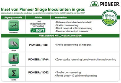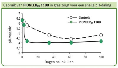 Combi-inoculanten bevatten vaak zowel melkzuurbacteriën als een broeiremmer (L. buchneri). In de latere snedes is echter vooral de snelle conservering belangrijk. Het is belangrijk om daar dan ook maximaal op te focussen. Broei is namelijk meestal geen issue in deze kuilen. Daardoor heeft het vaak minder zin om combi-middelen te gebruiken, die zowel wat doen op broei als op conservering. Door het gebruik van het enkelvoudige middel 1188, wordt gezorgd voor een zeer snelle pH-daling.