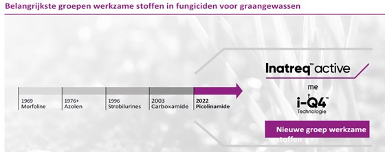 Op het overzicht zien we de ontwikkeling van de fungcidengroepen in graan. De vorige nieuwe werkingswijze was de groep van de Carboxamiden (SDHI’s) en dateert alweer van 20 jaar geleden.