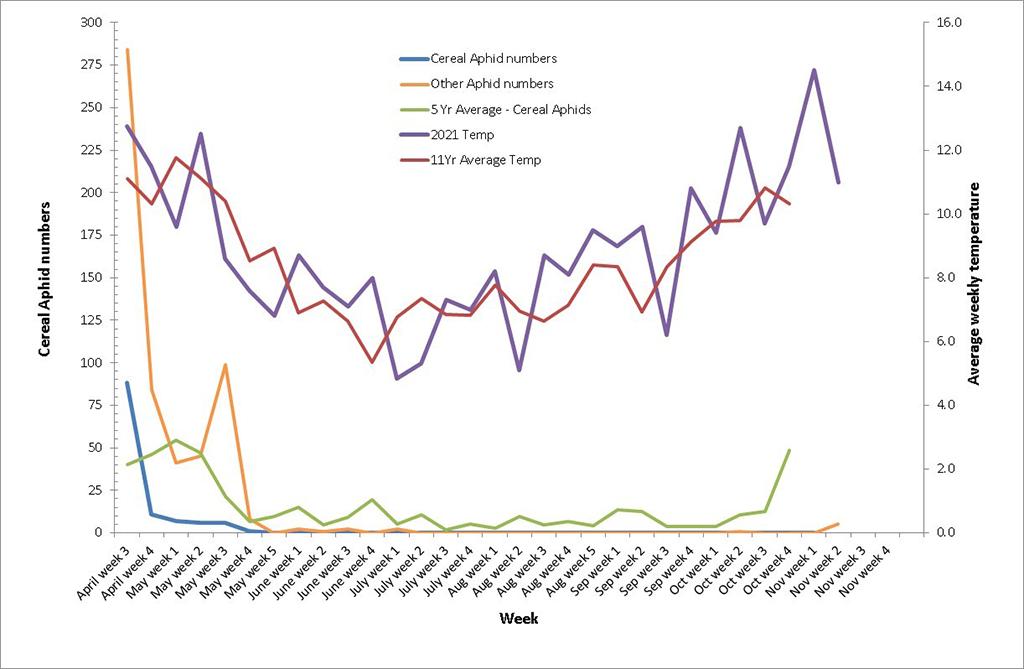 The number of cereal aphids caught in our Rokeby suction trap (blue line) between the 4th and 8th of November (Nov week 2) was 5 and is displayed in the graph below, along with;
