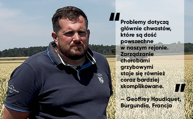 Geoffrey Haudiquet, prowadzący gospodarstwo w Burgundii we Francji, zmaga się z wieloma problemami w trakcie sezonu. „Problemy dotyczą głównie chwastów, które są dość powszechne w naszym rejonie. Mamy do czynienia z chwastami wieloletnimi, jedno- i dwuliściennymi – mówi. „Poza tym pojawiają się choroby, które obserwujemy wiosną. Zarządzanie chorobami grzybowymi staje się coraz bardziej skomplikowane”.