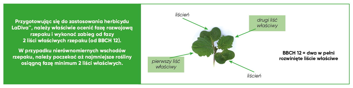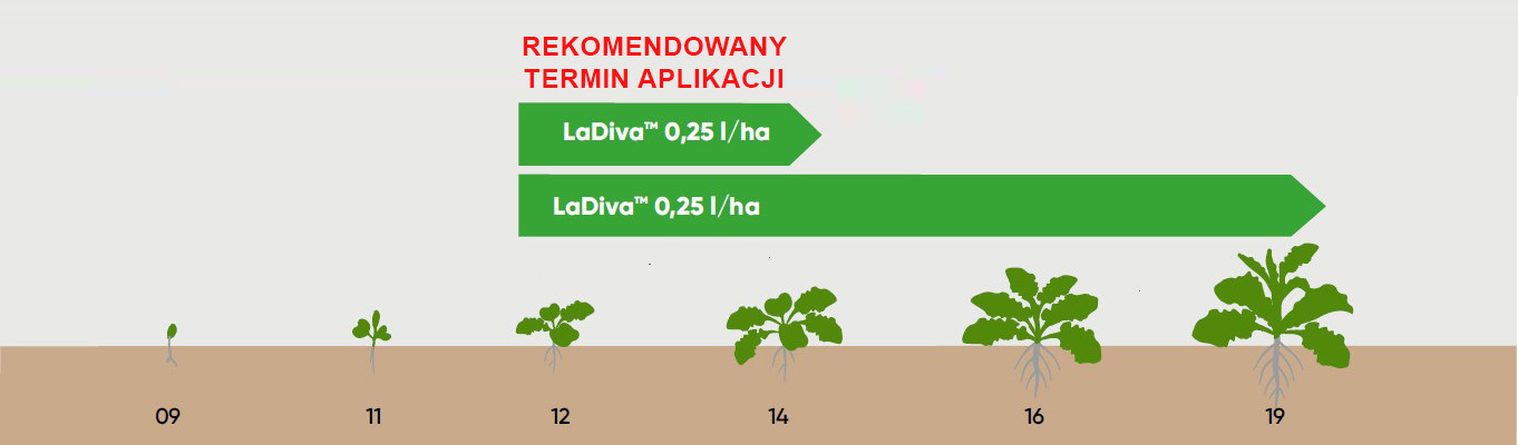 LaDivę można stosować jesienią, od 2 do 9 liści rzepaku (BBCH 12-19) w dawce 0,25 l/ha, jednak w celu uzyskania najlepszych efektów, rekomendowany termin aplikacji, to faza od 2 do 4 liści właściwych rzepaku (BBCH 12-14).