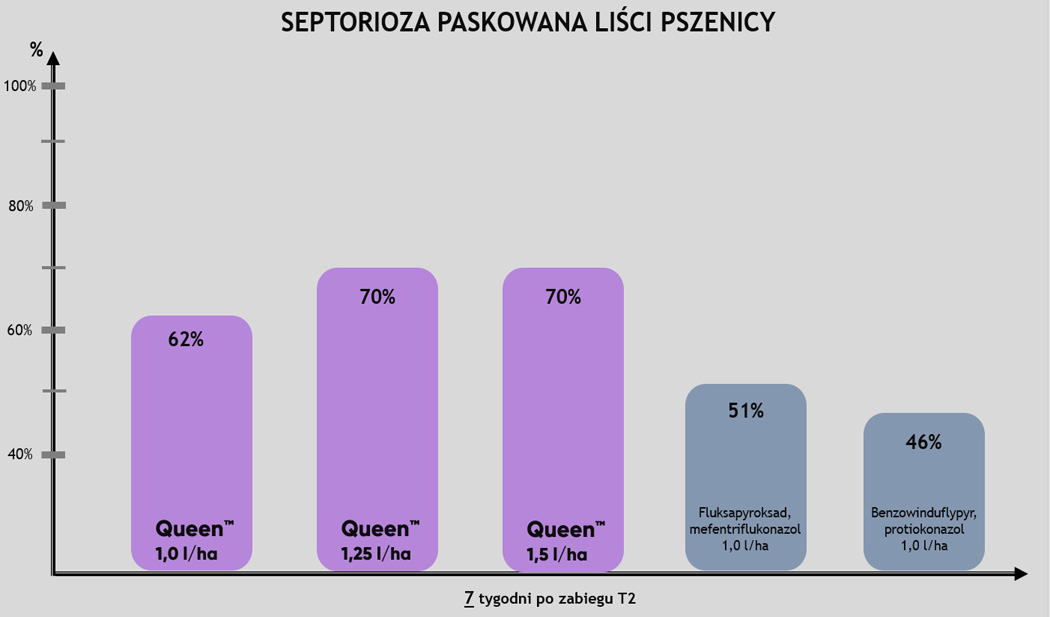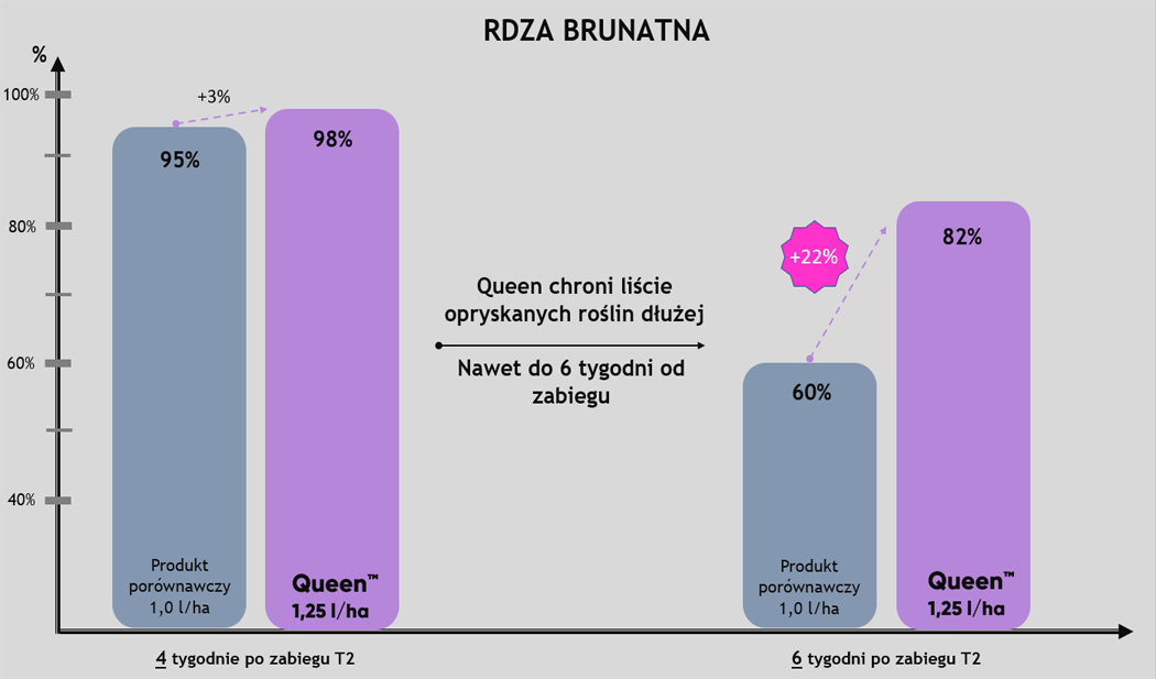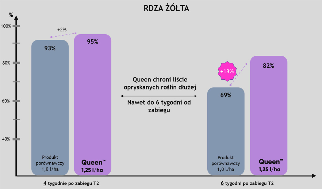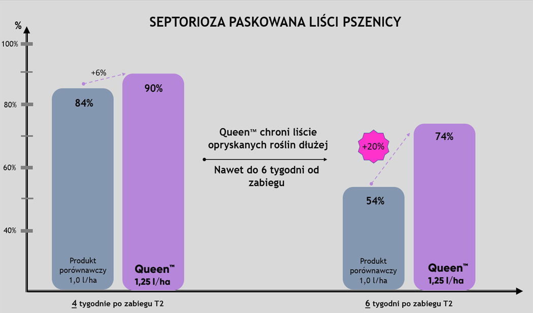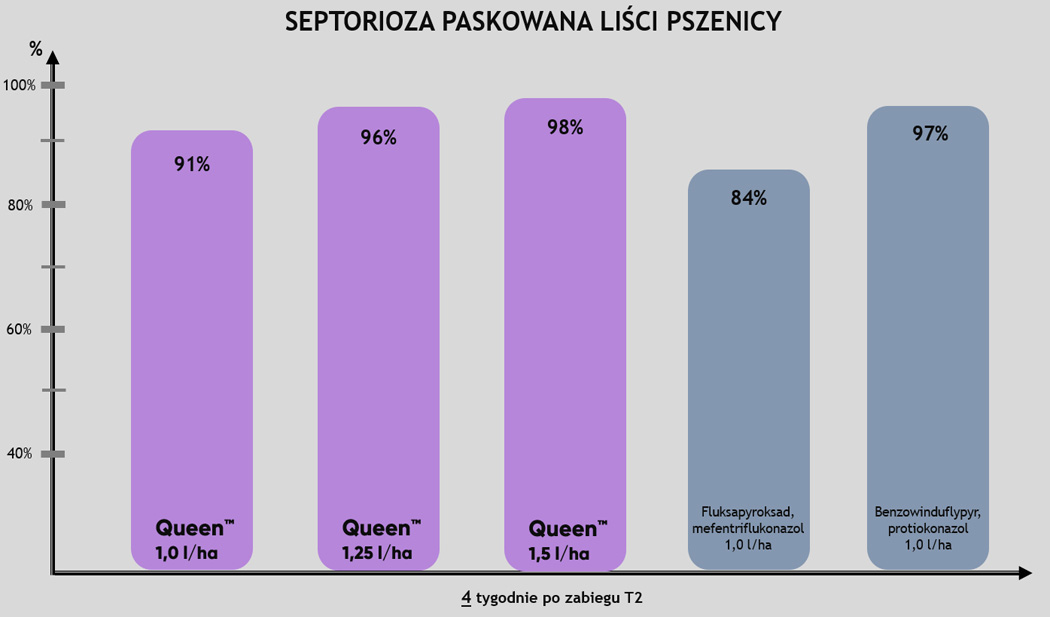 Queen™ to fungicyd na T2, który chroni Twoje uprawy do 6 tygodni od wykonania zabiegu! Bardzo wysoka skuteczność na septoriozę paskowaną liści pszenicy, rdzę żółtą czy rdzę brunatną, została potwierdzona także w polskich warunkach klimatycznych.
