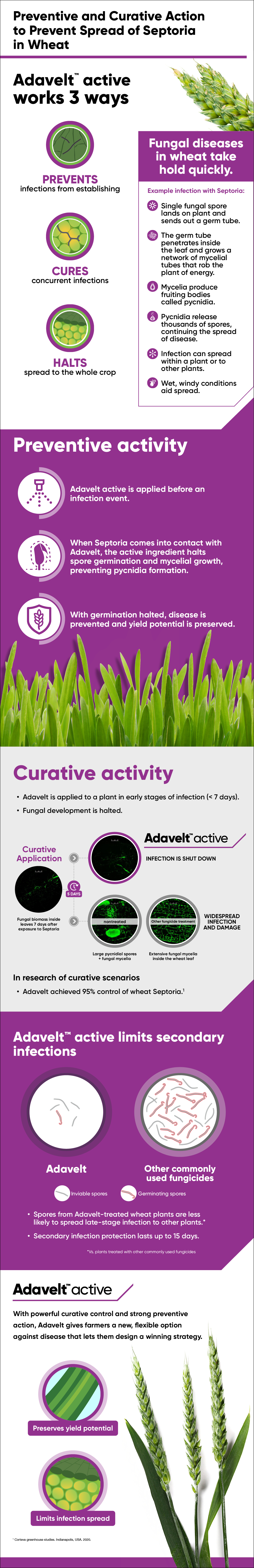 Adavelt™ active fungicide works to both prevent and cure fungal diseases in cereals. This makes it an especially effective option against diseases like wheat Septoria that can spread quickly and devastate harvest yield and quality. With multi-way efficacy, Adavelt helps halt fungal diseases at every stage.