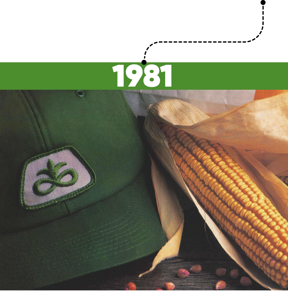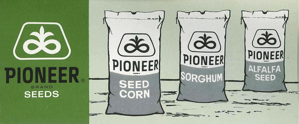 That same year, seed bags transitioned from cloth to the nowfamiliar gold and white paper design, proudly featuring the Pioneer name in green and the Trapezoid symbol — marking a new chapter in the brand’s identity.