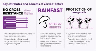 Corteva Agriscience crop protection innovation is focused on enabling farmers to grow more fruits, vegetables and grains our world depends on while maintaining a successful farm operation and caring for the planet. Zorvec™ active embodies these goals, providing a well- rounded solution to oomycete challenges. It has incredibly low use rates—just a fraction of what other commonly used fungicides require. With Zorvec, farmers can produce more and higher- quality crops that contribute to a successful, sustainable farming future.