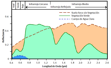 Os nossos olhos vêm uma parte da luz do sol (luz visível), e nós distinguimos os objetos pela luz visível que refletem. Existem outras partes da luz solar que não podemos detetar com os nossos olhos, por exemplo a radiação infravermelha (NIR, do inglês Near Infrared Radiation, radiação infravermelha próxima). Neste sentido, e isto é importante para o diagnóstico, a quantidade de luz refletida é diferente de acordo com as superfícies, e embora plantas de diferentes espécies e que crescem em diferentes condições reflitam a luz de forma diferente, existem algumas características da reflexão da luz solar que são comuns para todas as plantas. Assim, por exemplo, a vegetação reflete cerca de 5-15% da luz visível que recebe, e uns 40-80% da radiação infravermelha, enquanto um terreno nu desprovido de vegetação, reflete cerca de 15-25% da luz visível que recebe, e uns 30-35% da radiação infravermelha (Figura 1). Esta proporção da luz refletida sobre a quantidade de luz que incide é conhecida como refletância.