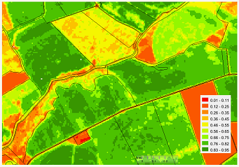 O valor do NDVI indica a quantidade de vegetação fotossinteticamente ativa, ou seja, a quantidade de biomassa vegetal em funcionamento. Os valores de NDVI estão compreendidos entre 0 e 1. As áreas da parcela com mais vegetação têm um NDVI maior devido a menor reflexão da luz (devido a uma maior quantidade de clorofila que absorve a luz visível) e maior reflexão do NIR (devido à maior quantidade de biomassa). Estes valores de NDVI mostram-se na imagem segundo uma escala de cores, de modo similar aos níveis de produção num mapa de rendimento. Na Figura 3, os valores de NDVI mostram-se segundo a escala na legenda. As imagens de NDVI têm uma resolução de 10 e 30 metros para imagens do Sentinel-2A e do Landsat8, respetivamente.