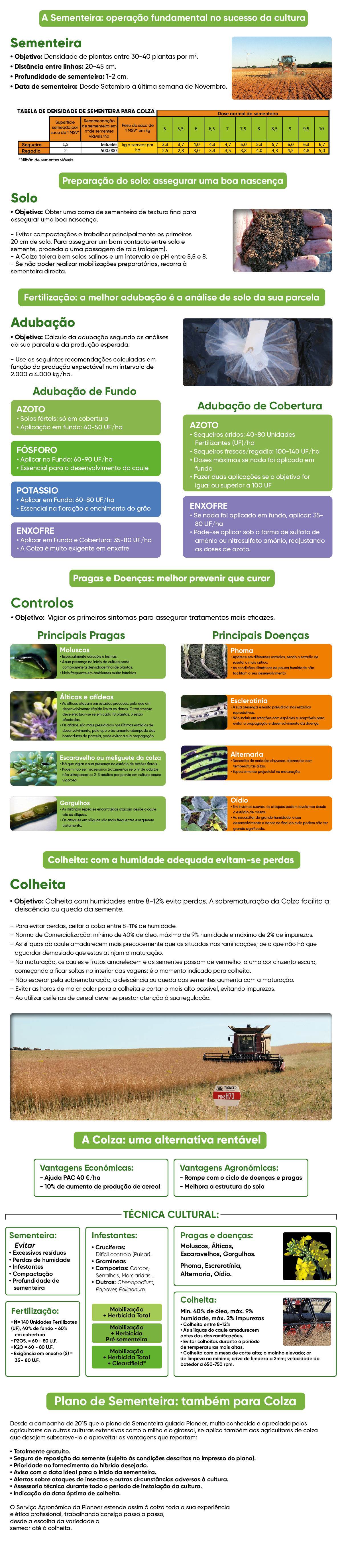 A razão fundamental pela qual a Pioneer aposta em exclusivo nas colzas híbridas, resulta da sua maior produtividade, tolerância a doenças e maior estabilidade relativamente às variedades convencionais. Assim, o menor custo da semente de colza convencional relativamente à da semente híbrida, não compensa em absoluto a diferença de comportamento agronómico e de rentabilidade entre ambas, ainda mais quando se trata de uma cultura que pode ter um preço interessante no mercado e que representa em muitas zonas de Portugal uma excelente alternativa na rotação com o cereal.