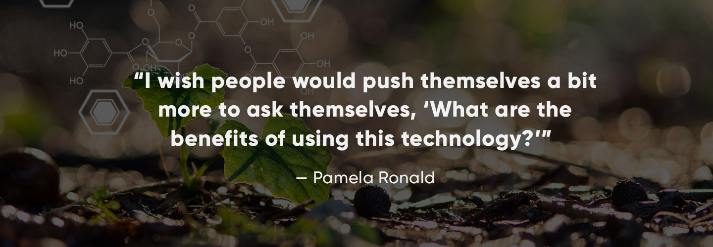 Ronald navigates the subject of agricultural science with a deftness that reflects her decades of experience, and believes that, despite the controversy around GMOs, a shared goal motivates everyone involved in the discussion. “Most people want to advance sustainable agriculture, feed the poor or malnourished, and use our land and water more efficiently.”