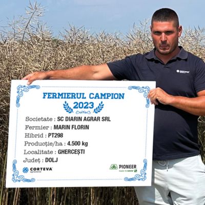 În localitatea Ghercești, domnul Florin Marin lucrează 239 ha, iar rapiță în acest an agricol a semănat pe 65 ha. Pentru o suprafață de 10 ha a semănat hibridul PT298/Agile și a obținut o producție de 4.500 kg/ha. “Planta premergătoare pentru acest hibrid a fost grâul, astfel că terenul a pregătit corespunzător, adică am dezmiriștit și am scarificat, apoi am intervenit cu combinatorul sau discul, depinde de cum se pregătea terenul. La pregătirea patului germinativ am și fertilizat cu îngrășământ triplu 15 – 250 kg/ha. Am semănat la finalul lunii august, după răsărire am erbicidat, am aplicat și un regulator de creștere, din nou un erbicid și la fiecare dintre aceste treceri am administrat și un insecticid. Am continuat în primăvară cu fertilizarea și am administrat la începutul lunii martie 200 kg/ha de uree, iar în ceea ce privește tratamentele pot spune că au mai fost două intervenții cu fungicid și insecticid și am recoltat în data de 11 iulie. Am fost foarte mulțumit de cum s-a comportat hibridul și producția a fost foarte bună. De fapt, a fost prima oară când am semănat hibrizi Pioneer, nu doar la rapiță, ci și la porumb și floarea-soarelui am semănat pentru prima oară, dar sunt foarte mulțumit”, a specificat fermierul campion. Încântat fiind de prima experiență cu hibrizii Pioneer, domnul Florin Marin a ales din nou pentru această toamnă hibridul PT298 pentru o suprafață de 25 ha.
