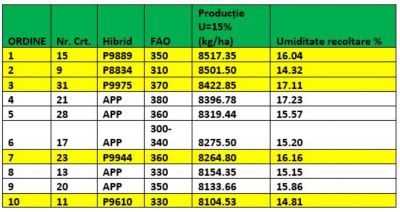 Tabelul cu media pe 8 locații a primilor 10 hibrizi demonstrează afirmațiile de mai sus: