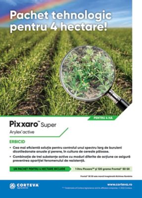 Pachetul Pixxaro™ Super conține 1L Pixxaro™ (fluroxipir 280 g/L și halauxifen-metil 12 g/L, cunoscută sub denumirea de brand Arylex™ Active, prima moleculă care aparține noii clase Arylpicolinate) și 120 g Frontal 50 SX (500 g/kg tribenuron metil), fiind destinat pentru o suprafață de 3,2-4 hectare, în funcție de gradul de infestare, pentru combaterea buruienilor dicotiledonate anuale și perene din culturile de cereale atât de toamnă cât și de primăvară: grâu, grâu durum, orz, orzoaică, triticale și secară. Atenție – nu se utilizează la cultura de ovăz!