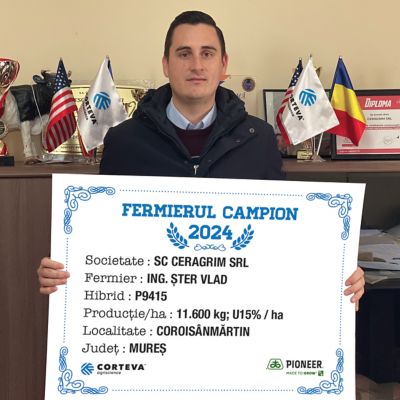 Domnul ing. Vlad Șter, din județul Mureș, este unul dintre fermiierii care obțin an de an rezultate foarte bune cu hibrizii Pioneer, motiv pentru care a fost desemnat în mai multe rânduri fermier campion. Campania trecută, hibridul P9415 i-a oferit o producție de 11.600 kg/ha. Rezultate foarte bune a avut și la porumbul pentru siloz, deoarece cu hibridul P0268 o obținut producții între 45 t/ha și 65 t/ha, în funcție de zona de cultivare.