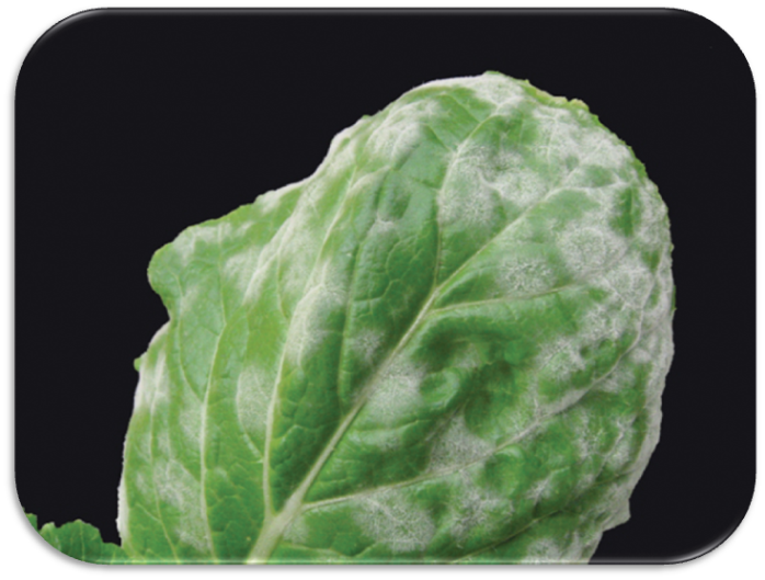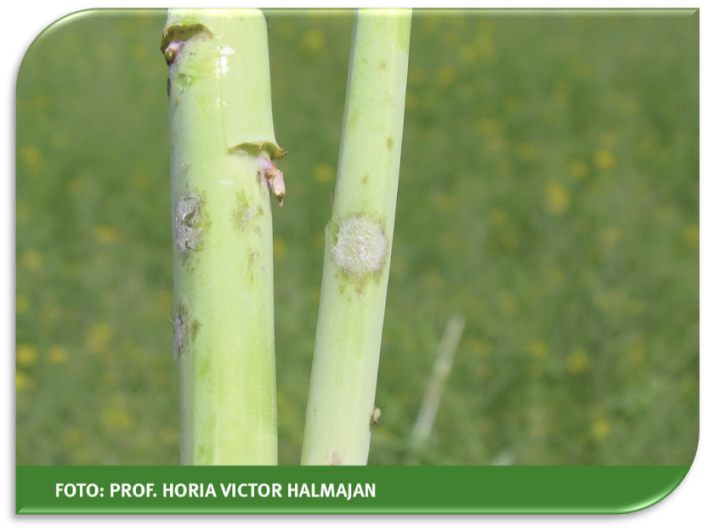 Simptome: Este o boală care poate apărea încă din toamnă. Pe ambele feţe ale frunzei se formează o pâslă albicioasă („cristale de gheaţă"), care apoi devine pulverulentă, datorită apariţiei fructificaţiilor. În condiţii favorabile agentului patogen, petele pot creşte, se unesc şi acoperă în întregime organele atacate: frunzele, tulpinile şi silicvele. Când atacul este foarte puternic, plantele pierd frunzele afectate.