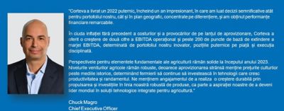 Perspectivele pentru agricultură rămân solide în 2023, cu o cerere record atât pentru cereale cât și pentru semințe oleaginoase, deoarece stocurile finale continuă să fie sub presiune. Prețurile mărfurilor sunt peste mediile istorice, iar bilanțurile fermierilor și nivelurile veniturilor rămân sănătoase, ceea ce îi determină pe fermieri să acorde prioritate tehnologiei pentru a maximiza rentabilitatea. Compania se așteaptă la o creștere a suprafeței semănate în SUA și continuă să monitorizeze condițiile meteorologice dinamice din întreaga lume.