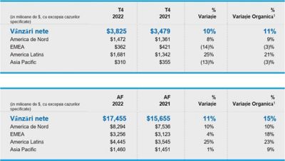 Pentru al patrulea trimestru încheiat la 31 decembrie 2022, vânzările nete au crescut cu 10% față de aceeași perioadă a anului trecut. Vânzările organice1 au crescut cu 11%, cu o contribuție importantă a Americii Latine și a Americii de Nord.