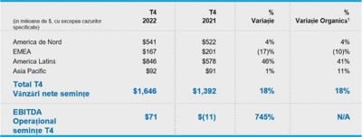 Vânzările nete de semințe au fost de 1,6 miliarde USD în al patrulea trimestru din 2022, în creștere de la 1,4 miliarde USD în trimestrul al patrulea din 2021. Creșterea vânzărilor a fost determinată de o majorare cu 19% a prețului, parțial afectată de o scădere cu 1% a volumului.
