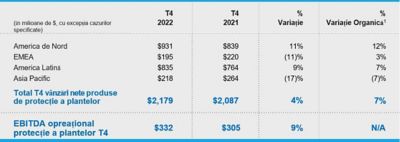 Vânzările nete de produse pentru protecția plantelor au fost de aproximativ 2,2 miliarde USD în al patrulea trimestru al anului 2022, comparativ cu aproximativ 2,1 miliarde USD în trimestrul al patrulea din 2021. Creșterea vânzărilor a fost determinată de o creștere de 7% a prețului, parțial afectată de un impact nefavorabil de 2% al schimbului valutar și de unul de un procent de 1% asupra portofoliului.