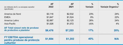 EBITDA operațional pe segment a fost de 1,7 miliarde USD în 2022, în creștere cu 40% față de 2021. Câștigurile de prețuri și de volum și acțiunile de mărire a productivității au depășit atât efectul costurilor mai mari ale inputurilor, inclusiv costurile materiilor prime cât și impactul nefavorabil al monedei. Marja EBITDA operațională pe segment s-a îmbunătățit cu aproximativ 330 de puncte de bază față de perioada anului precedent, în mare parte determinată de execuția prețurilor și de tehnologii noi și diferențiate.