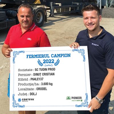 Cristian Dinuț din localitatea Orodel a obținut în acest an 3.600 kg/ha cu hibridul P64LE137 și a devenit fermier campion. “Lucrez 1.000 ha în cadrul a două societăți, iar floarea-soarelui am avut pe 285 ha. Pentru zona noastră producția pe care am obținut-o a fost una foarte bună. Acest hibrid a fost semănat după orz, astfel că terenul a fost arat și pregătit cu combinatorul. Am semănat la începutul lunii aprilie, atunci am fertilizat cu îngrășământ complex 5:30. În vegetație am efectuat o prașilă mecanică și am fertilizat pe rând cu nitrocalcar - 200 kg/ha, am erbicidat cu Express și atât, nu am administrat nici insecticid, nici fungicid, nici foliar pentru că nici nu a fost prezentă nicio boală, nu am avut deloc probleme în cultură. Singura problemă a fost seceta, dar chiar și așa, pentru zona noastră unde producțiile nu prea au depășit 2.000 kg/ha, producția de 3.600 kg/ha pe care am obținut-o cu P64LE137 a fost mai mult decât mulțumitoare. Este un hibrid bun, l-am avut și anii trecuți și a oferit cea mai bună producție din fermă și cu siguranță îl voi semăna anul viitor”, a afirmat fermierul campion.
