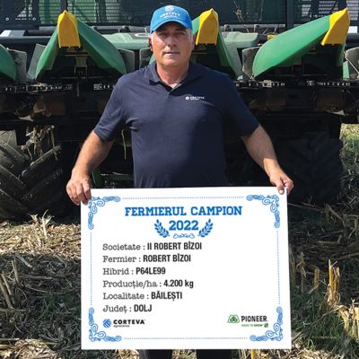 Următorul fermier campion din județul Dolj este domnul Robert Bizoi. Acesta își desfășoară activitatea în localitatea Băilești și a obținut 4.200 kg/ha cu hibridul P64LE99. “Lucrez 115 ha, iar floarea-soarelui am avut pe 35 ha în acest an. Cultura premergătoare a fost grâul, de aceea am făcut un ogor de vară, adică am scarificat, după care în toamnă am arat, iar în primăvară, la final de februarie, am fertilizat cu îngrășământ complex 18.46.0 – 150 kg/ha și am dat cu discul. În cea de-a doua jumătate a lunii martie, înainte de semănat, am intrat cu un compactor și o dată cu semănatul am administrat 150 kg/ha de azot. Am efectuat o prașilă, am erbicidat în stadiul de 2-6 frunze cu erbicidul Express și am administrat un îngrășământ foliar. Nu am mai administrat nimic altceva. Am început recoltatul pe 18 august și pot spune că am fost foarte mulțumit de hibridul P64LE99 pe care îl cultiv de mai mulți ani și în următoarea campanie voi semăna acest hibrid pe toată suprafața destinată florii-soarelui”, a declarat domnul Bizoi.