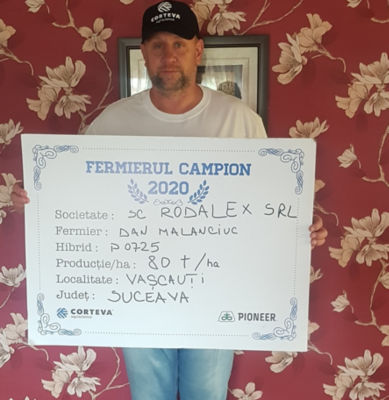 În județul Suceava, fermier campion campion a devenit domnul Dan Manciuc din localitatea Vășcăuți, care a obținut o producție de 80 t/ha. “Lucrez aproximativ 100 ha și am o fermă de vaci. Anul acesta am avut 22 ha cu porumb, iar culturile premergătoare au fost floarea-soarelui și grâu. Pe solele unde am avut grâu am arat în toamnă, pe celelalte am intrat cu un disc greu, iar în primăvară terenul a fost pregătit cu discul. Am semănat în perioada 25 aprilie – 10 mai. În toamnă am administrat gunoi de grajd, iar la semănat am aplicat 200 kg/ha de îngrășământ 20.20.0 și 200 kg/ha de nitrocalcar. În stadiul de 3-6 frunze am erbicidat, iar recoltatul a avut loc începând cu 20 septembrie”, a punctat fermierul sucevean. Acesta a mai adăugat faptul că anul viitor va semăna cca. 30 ha cu porumb, a fost foarte mulțumit de producția obținută cu hibridul Pioneer®, însă nu știe dacă va mai semăna porumb siloz, pentru că se gândește să renunțe la ferma de vaci.