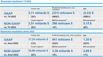 Profitul conform standardelor GAAP din operațiunile în curs de desfășurare, după impozitele pe venit, a reprezentat o pierdere de 231 de milioane de dolari în trimestrul al patrulea din 2023, comparativ cu o pierdere de 41 de milioane de dolari în trimestrul al patrulea din 2022. EBITDA operațional pentru trimestrul al patrulea a fost de 386 de milioane de dolari, în creștere cu 4% față de anul precedent.