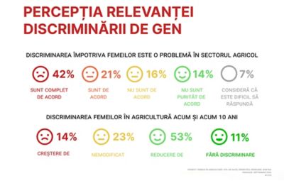 Rezultatele sondajului relevă faptul că, deși femeile intervievate au fost destul de îngăduitoare, peste 53% considerând că discriminarea a scăzut în ultimii 10 ani, iar 35% afirmă că aceasta va dispărea în următorii 10 ani, încă percep discriminarea de gen în agricultura românească ca fiind un fenomen răspândit. Peste 60% dintre respondente au răspuns că problema discriminării femeilor este prezentă în agricultură (42% - complet de acord și 21% - mai degrabă de acord), dar doar 13% au menționat discriminarea femeilor ca fiind o problemă personală pentru ele.