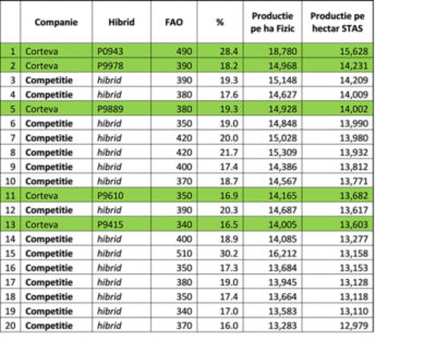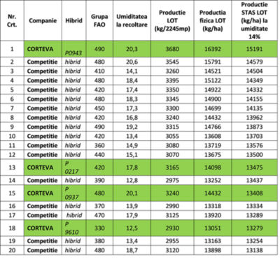 La evenimentul de la Targu Frumos, Corteva are in TOP 20 toti cei 5 hibrizi inscrisi in concurs, iar primele 2 locuri sunt ocupate tot de hibrizi Pioneer®, acelasi P0943 si P9978, un hibrid semitimpuriu. Analizand datele pe media hibrizilor intrati in competitie, situatia este urmatoarea: